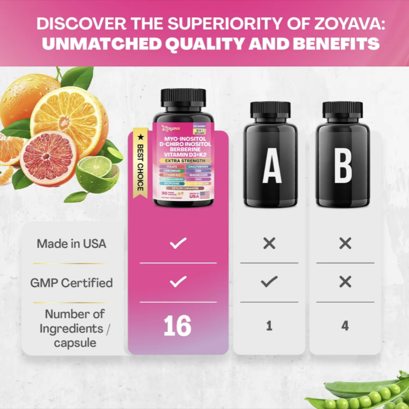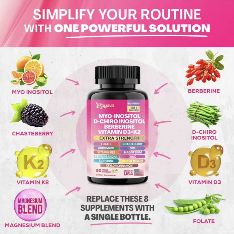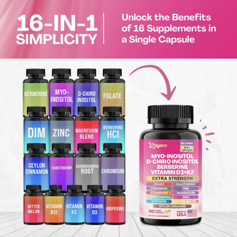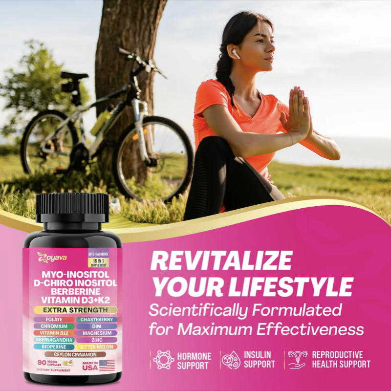 Zoyava Hormones & Cycle Support Women’s All-in-One Formula | 90 Vegan Capsules | Made in USA Zoyava Hormones & Cycle Support is a complete daily supplement formulated to support women’s natural hormonal balance, cycle regularity, and overall wellness. Powered by Myo-Inositol, D-Chiro Inositol, and 13+ carefully selected ingredients, it’s designed to help you feel more balanced, energized, and supported—every day. Benefits:·Supports natural hormonal balance·Helps promote cycle regularity·Supports energy, mood, and stress response·Includes ingredients that support metabolism and daily wellness Key Ingredients:·Myo-Inositol + D-Chiro Inositol – Support for cycle and ovarian health·Berberine, Bitter Melon, Chromium – Support for metabolism and blood sugar balance·Chasteberry, Ashwagandha, DIM – Support for hormonal rhythm and stress balance·Magnesium, Zinc, Folate, B12, Vitamin D3 + K2 – Foundational nutrients for daily function·Bioperine – Included to enhance nutrient absorption Who it is best for:This product is best for women seeking daily support for hormonal balance and a smoother menstrual cycle. It’s also ideal for individuals who want to maintain a steady mood, consistent energy levels, and overall well-being throughout the month. Made with clean, plant-based ingredients, it’s perfect for those who prefer a natural approach to everyday wellness without compromising on quality or effectiveness.·Women seeking daily hormonal and menstrual cycle support·Individuals looking to maintain balanced mood, energy, and overall well-being·Those wanting a clean, plant-based supplement to support everyday wellness naturally DISCLAIMERThis statement has not been evaluated by the Food and Drug Administration. This product is not intended to diagnose, treat, cure, or prevent any disease.